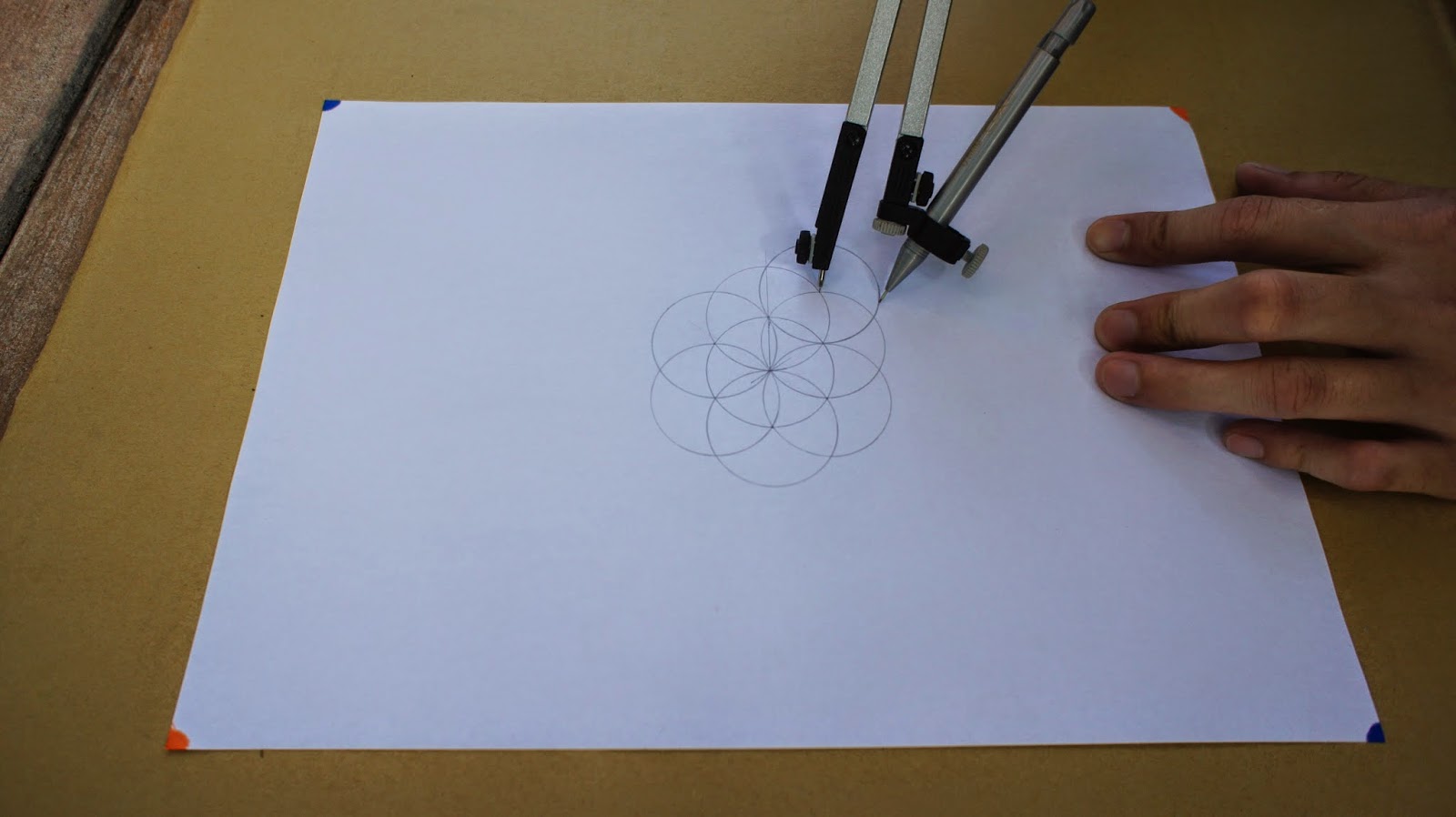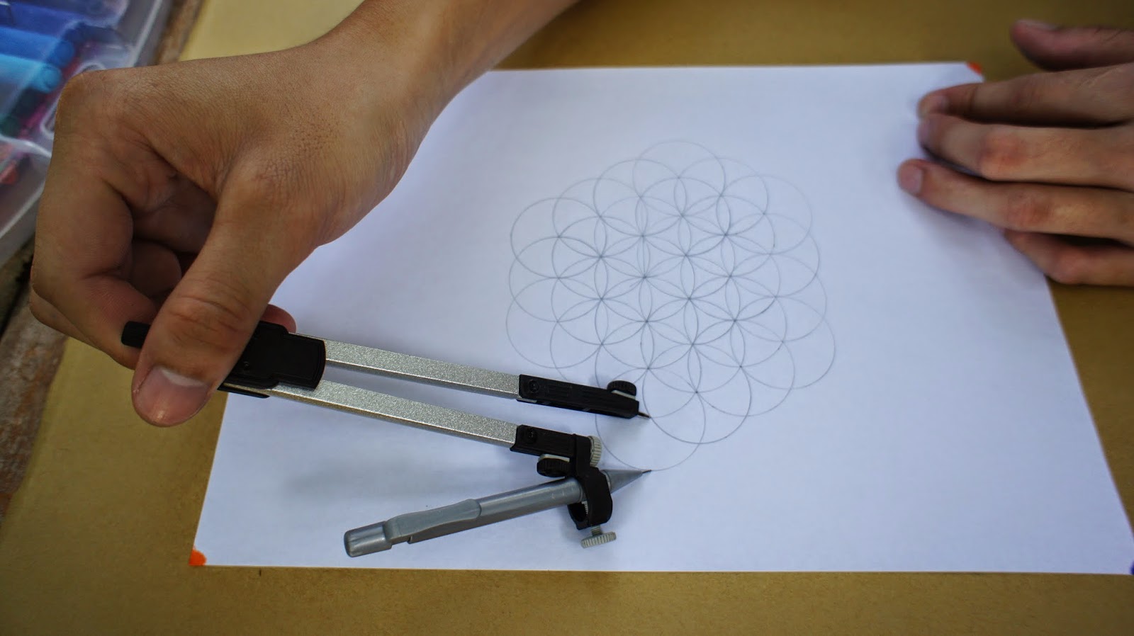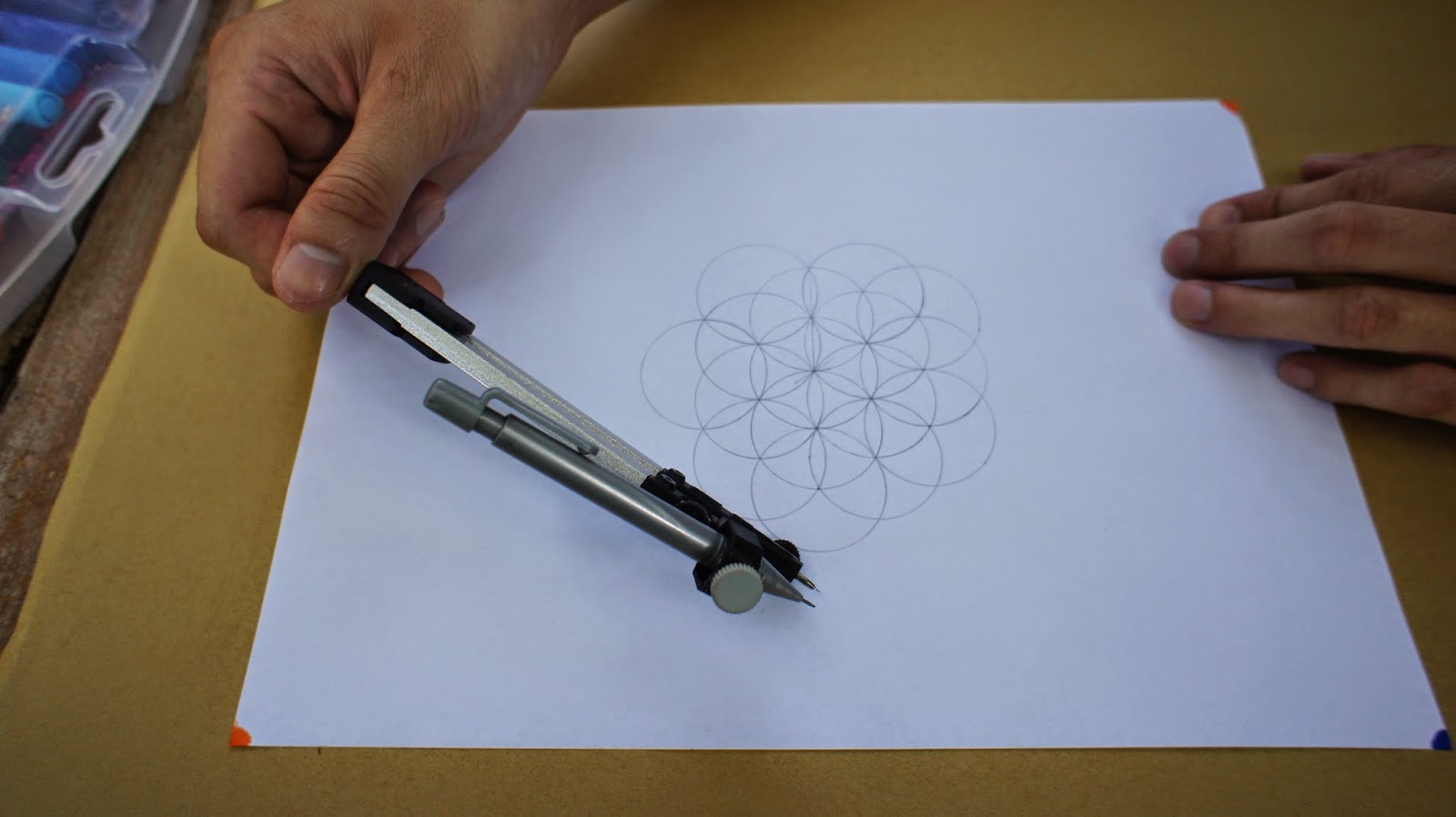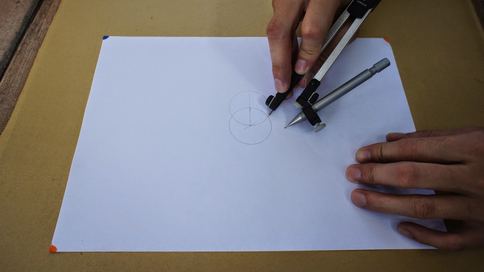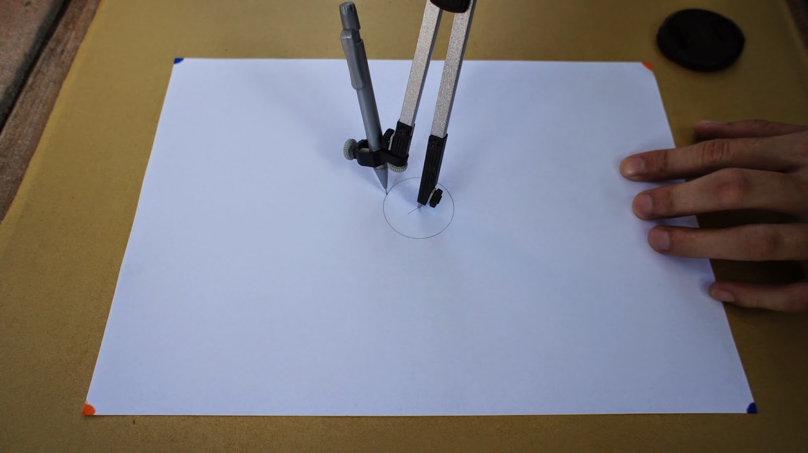 接下來是重頭戲,將圓規的定心針放置於圖紙的中心點,就可以繪畫第一個圓