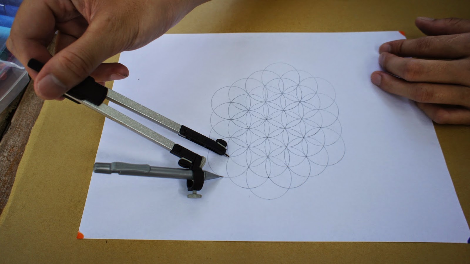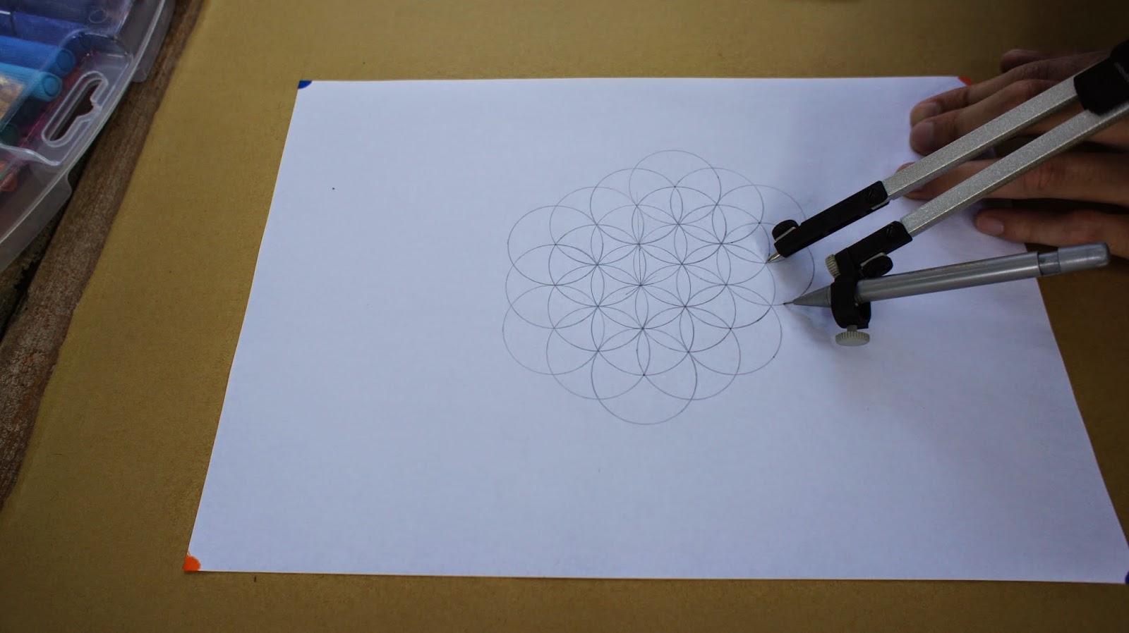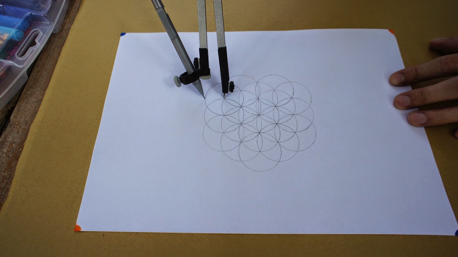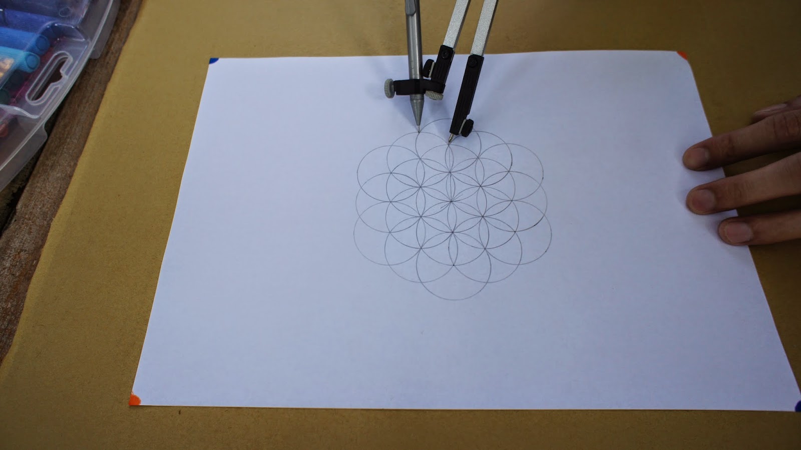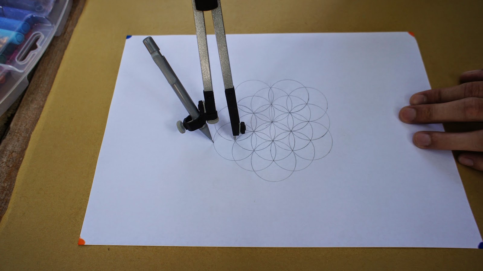 接下來是重頭戲,將圓規的定心針放置於圖紙的中心點,就可以繪畫第一個圓