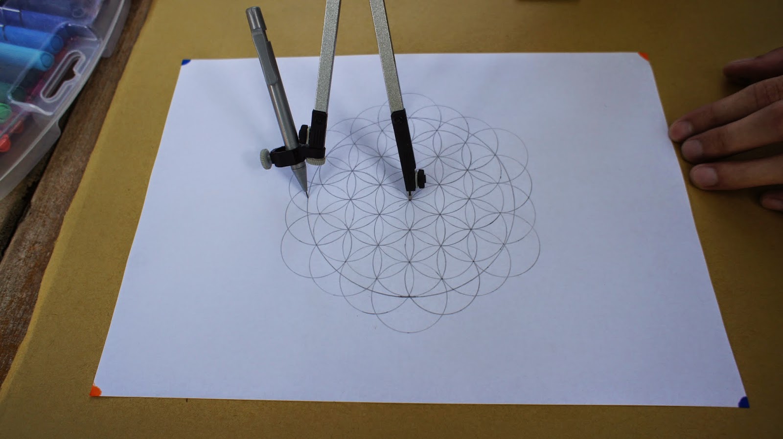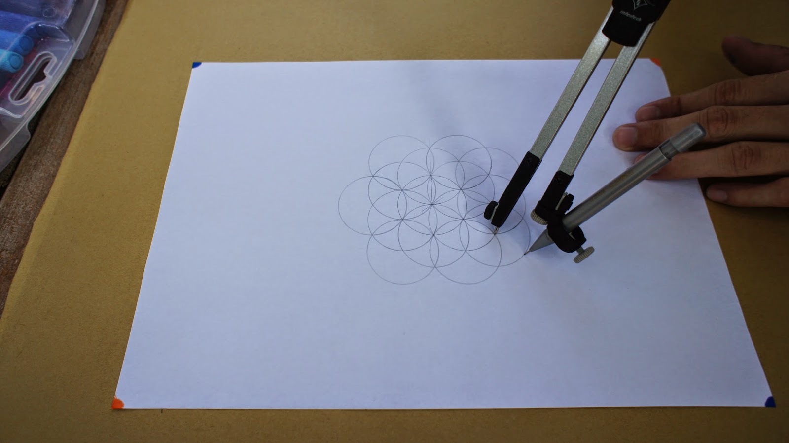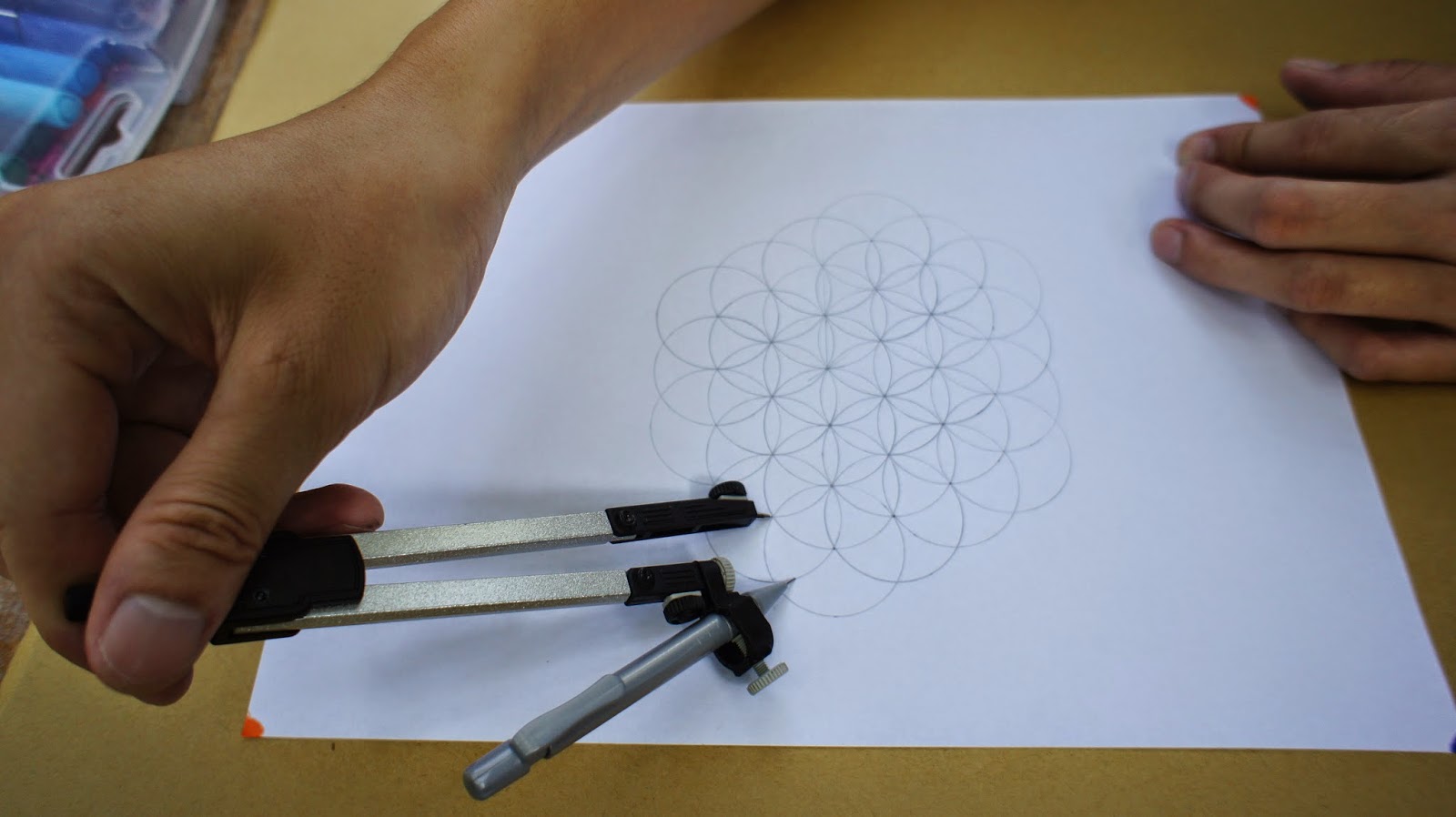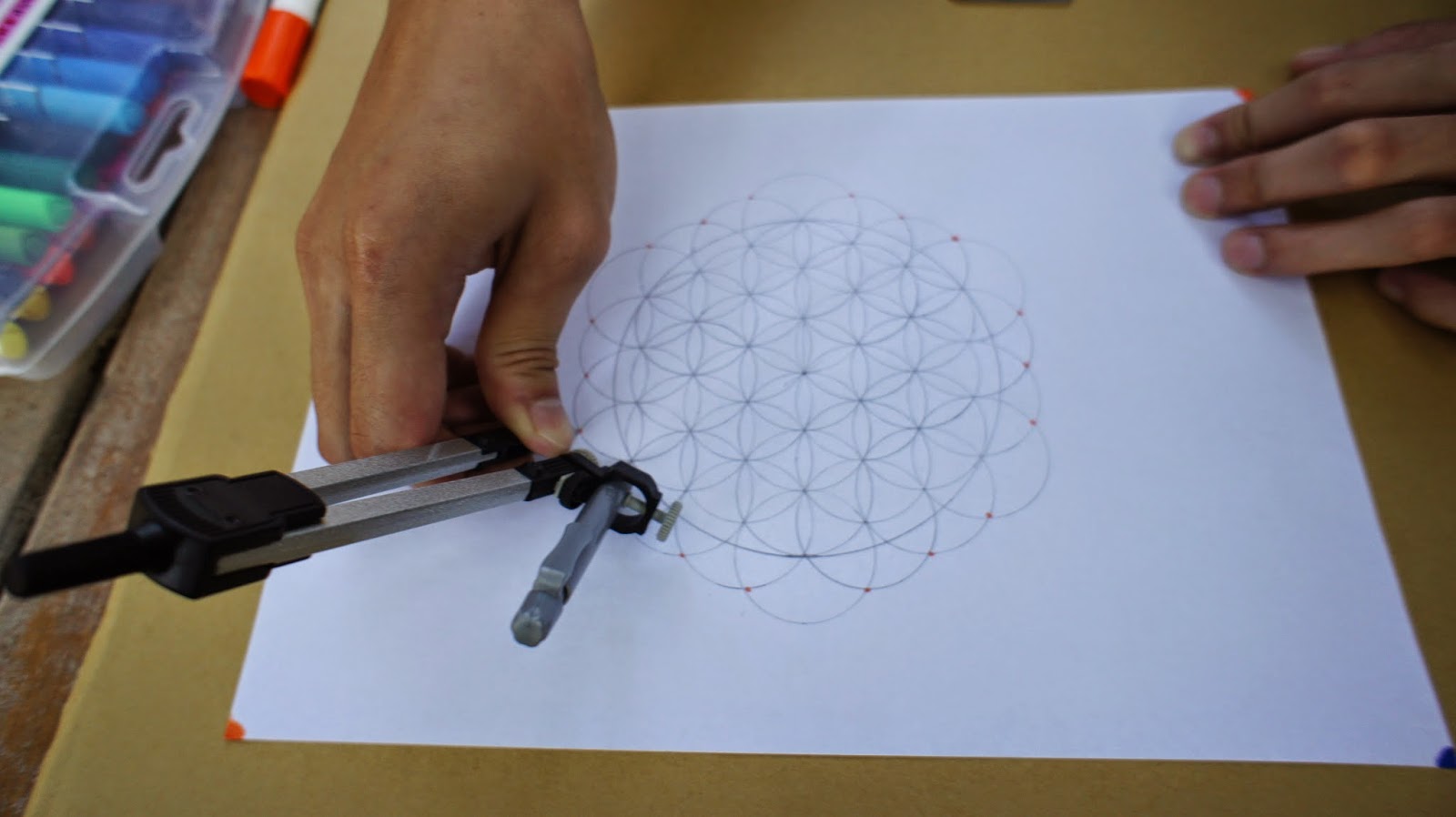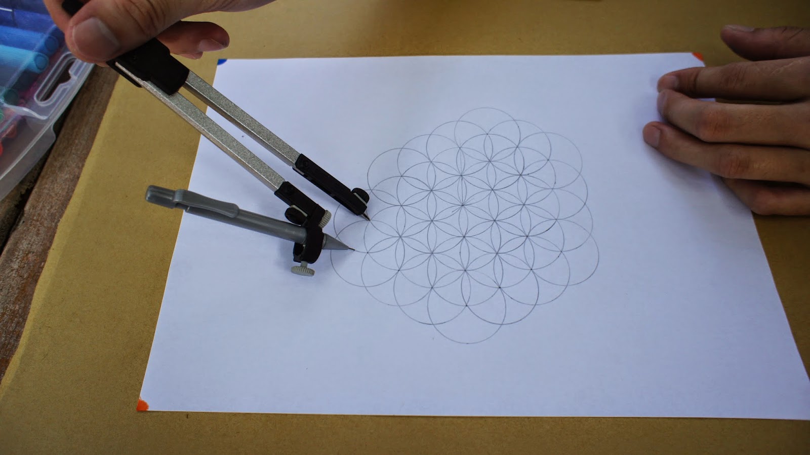 接下來是重頭戲,將圓規的定心針放置於圖紙的中心點,就可以繪畫第一個圓