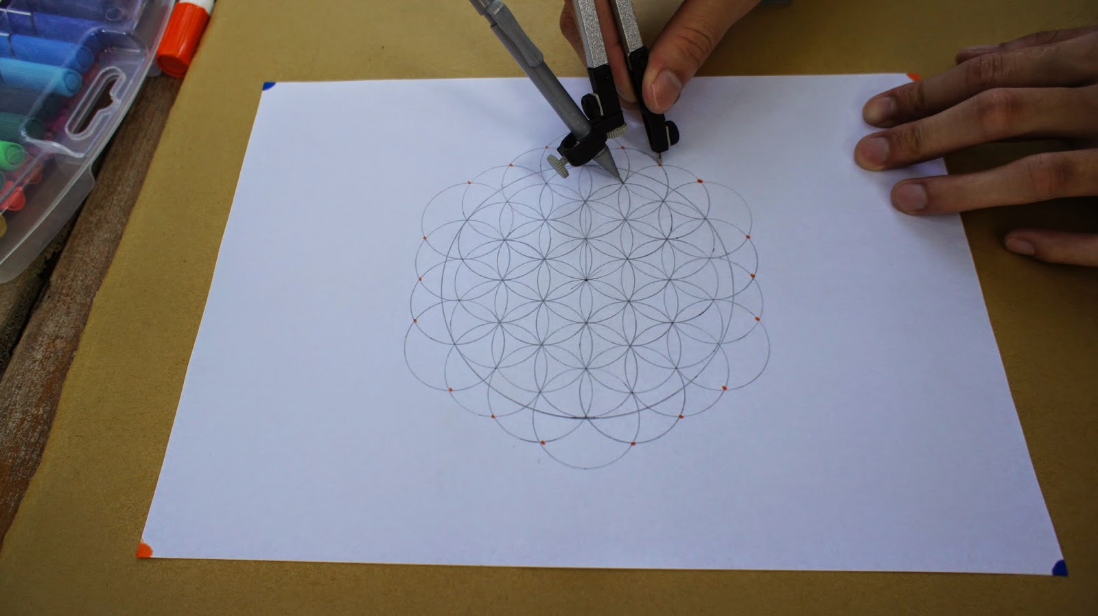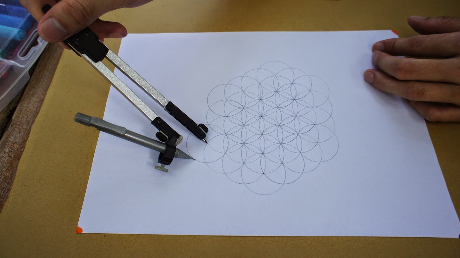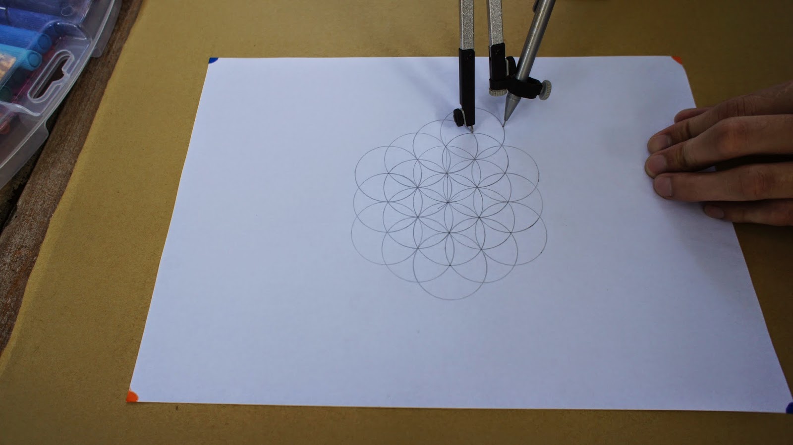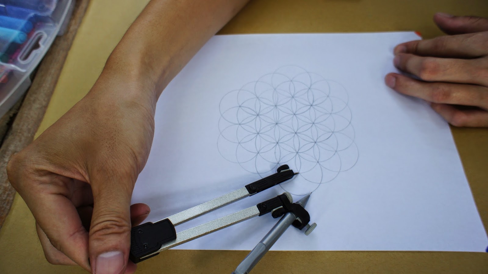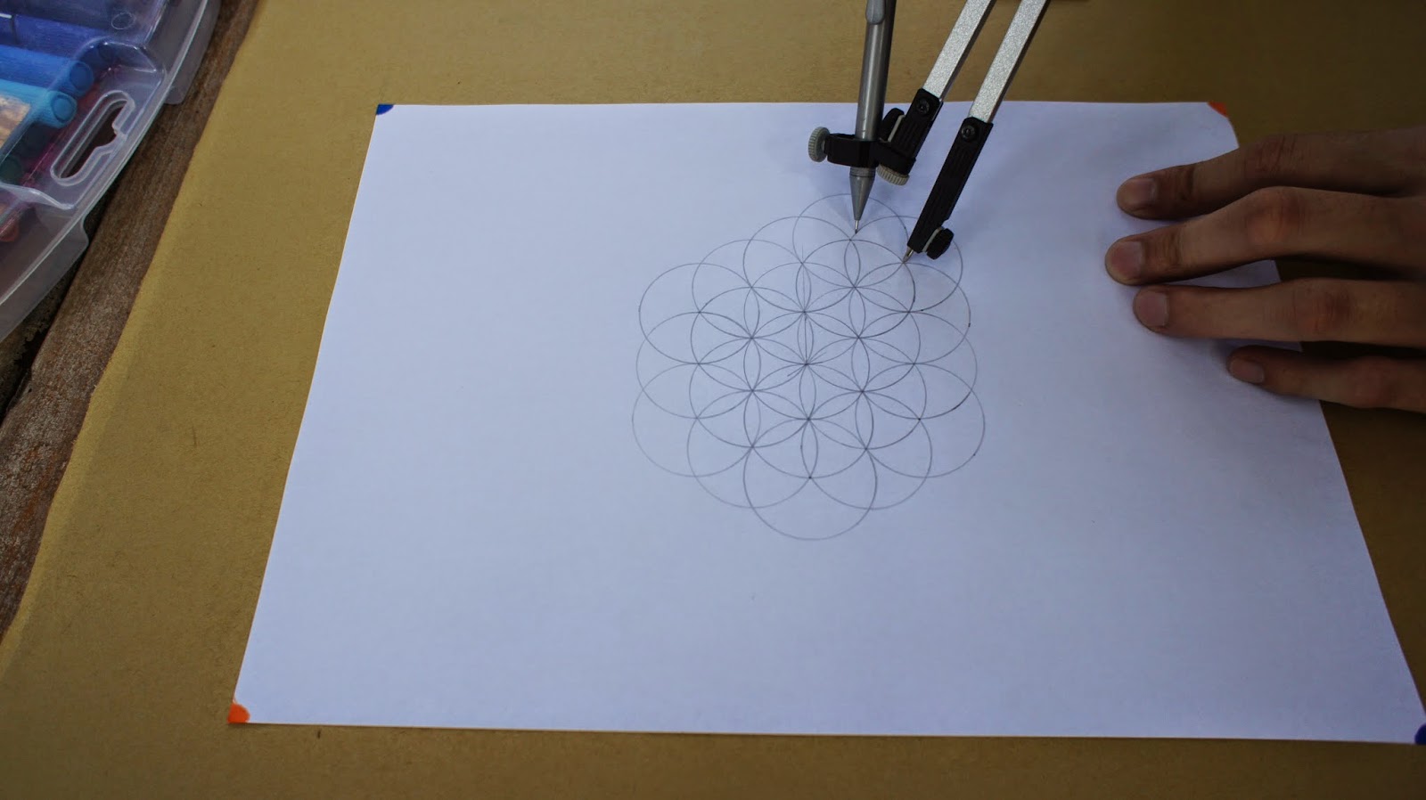 接下來是重頭戲,將圓規的定心針放置於圖紙的中心點,就可以繪畫第一個圓