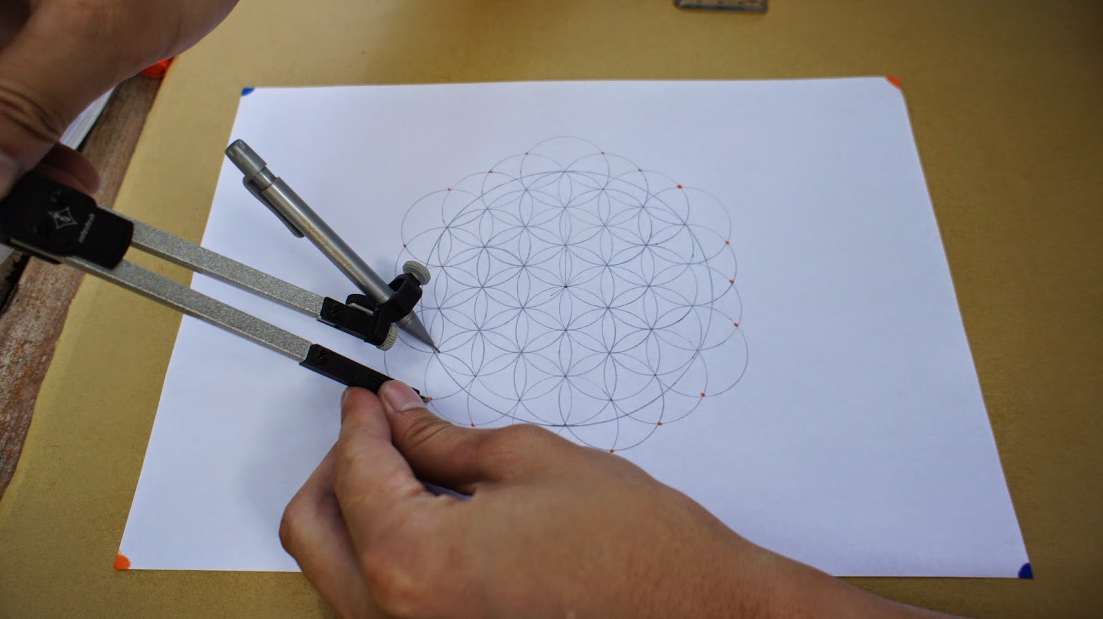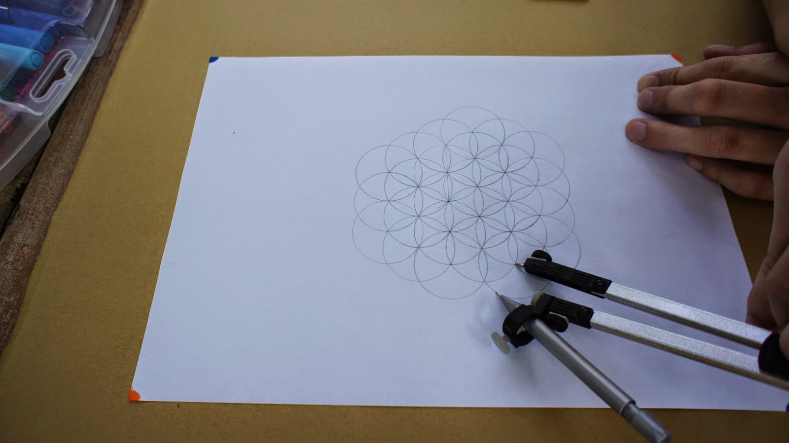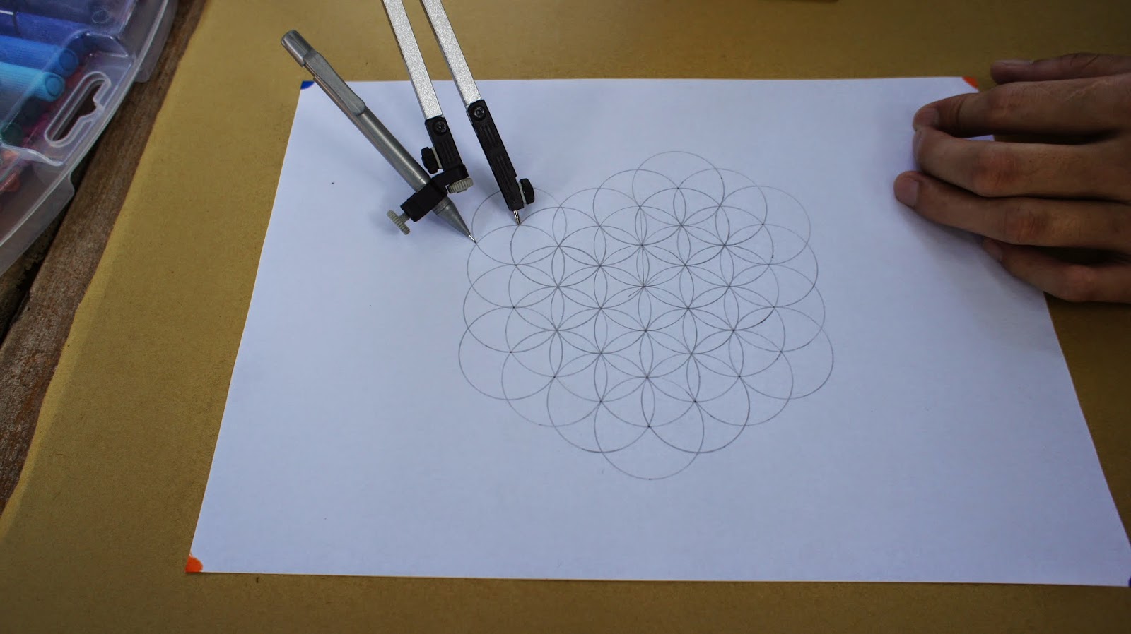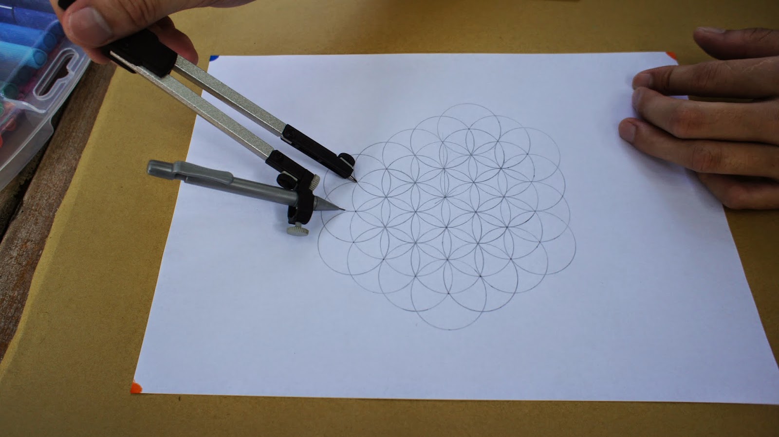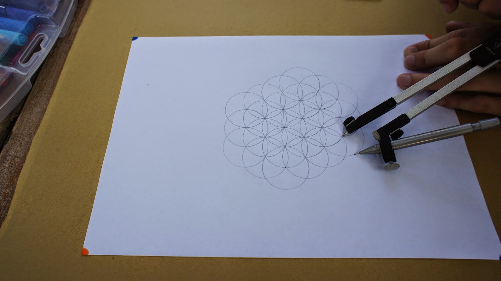接下來是重頭戲,將圓規的定心針放置於圖紙的中心點,就可以繪畫第一個圓