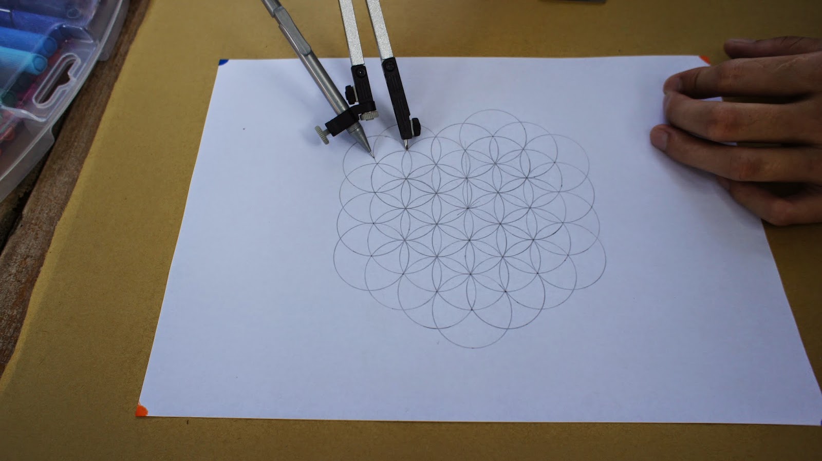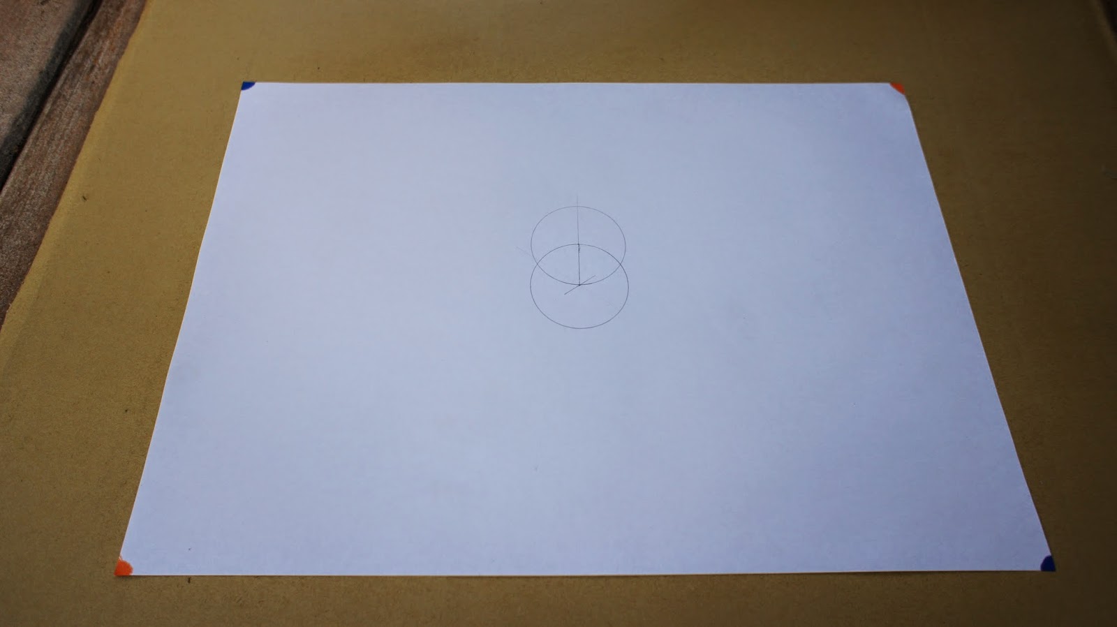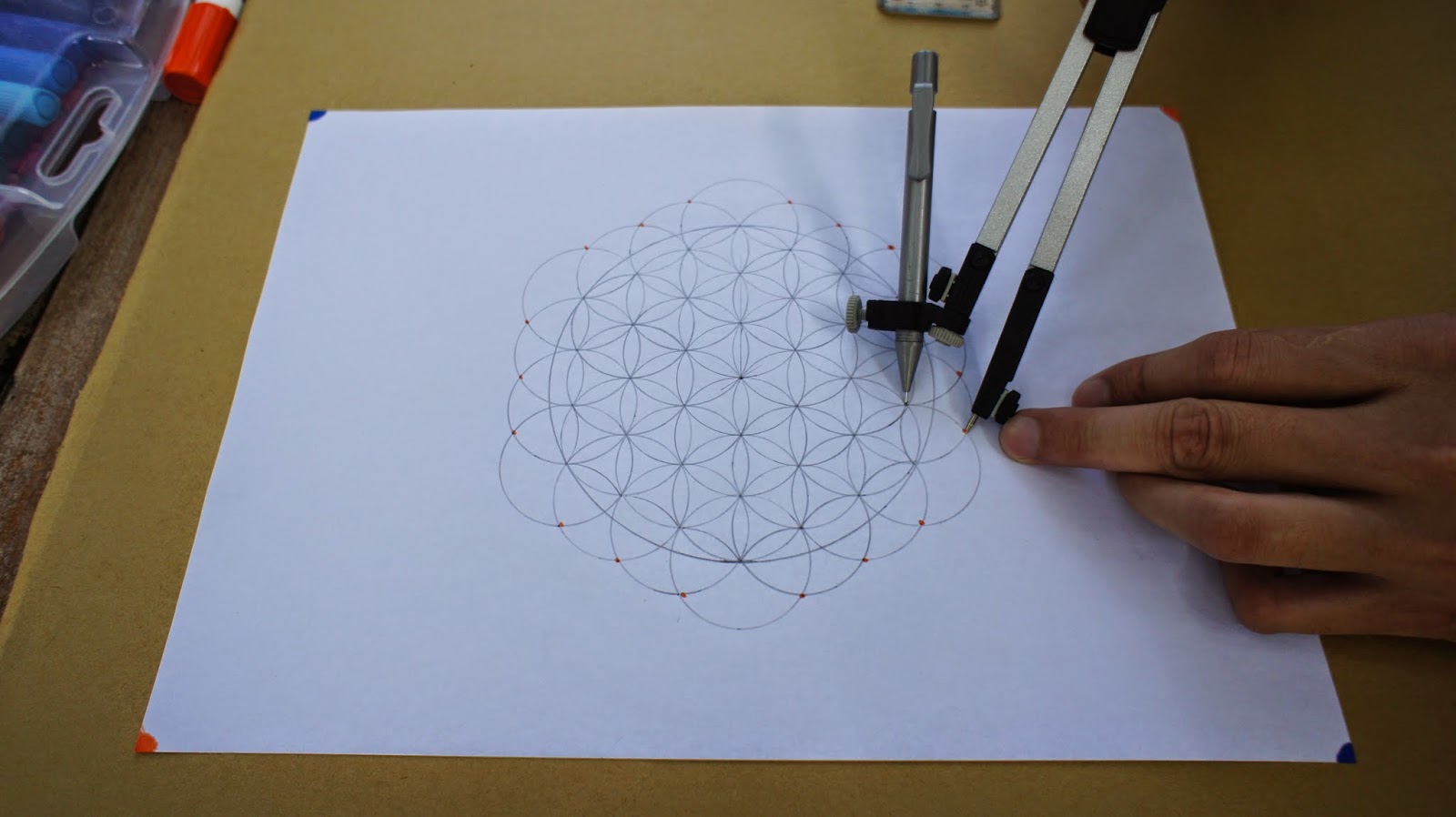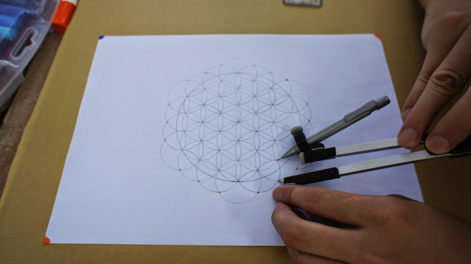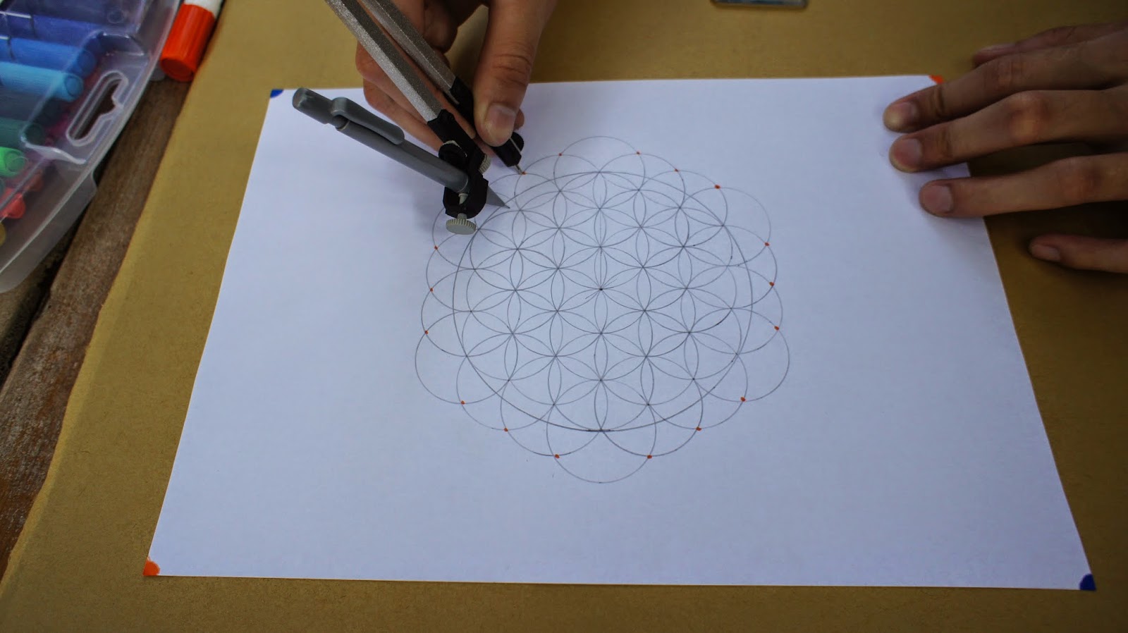 接下來是重頭戲,將圓規的定心針放置於圖紙的中心點,就可以繪畫第一個圓
