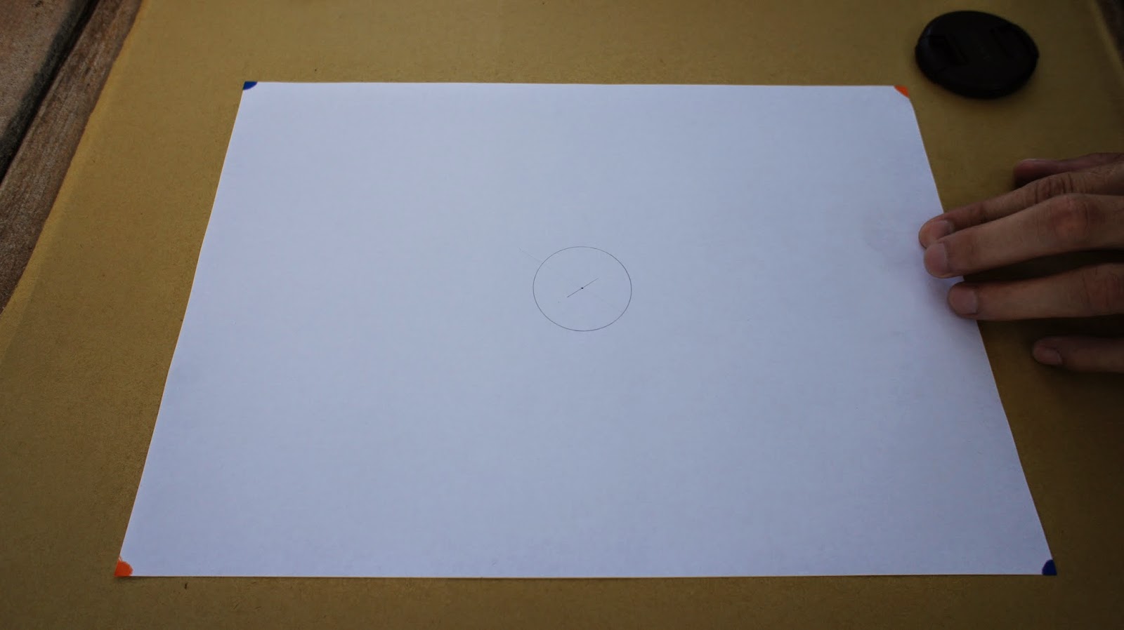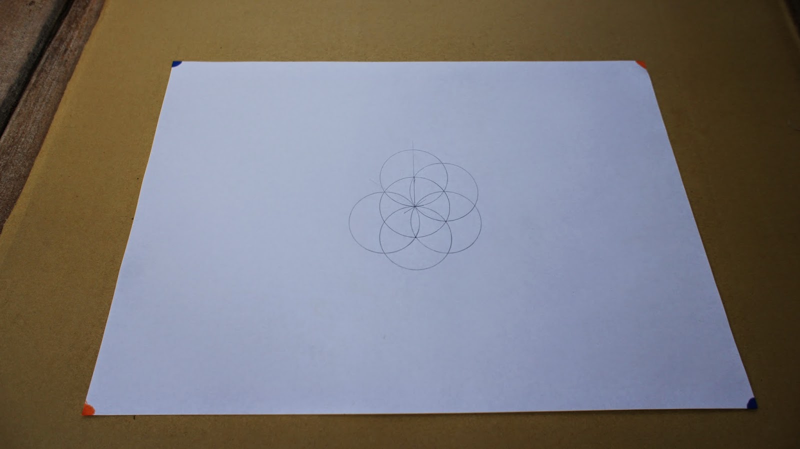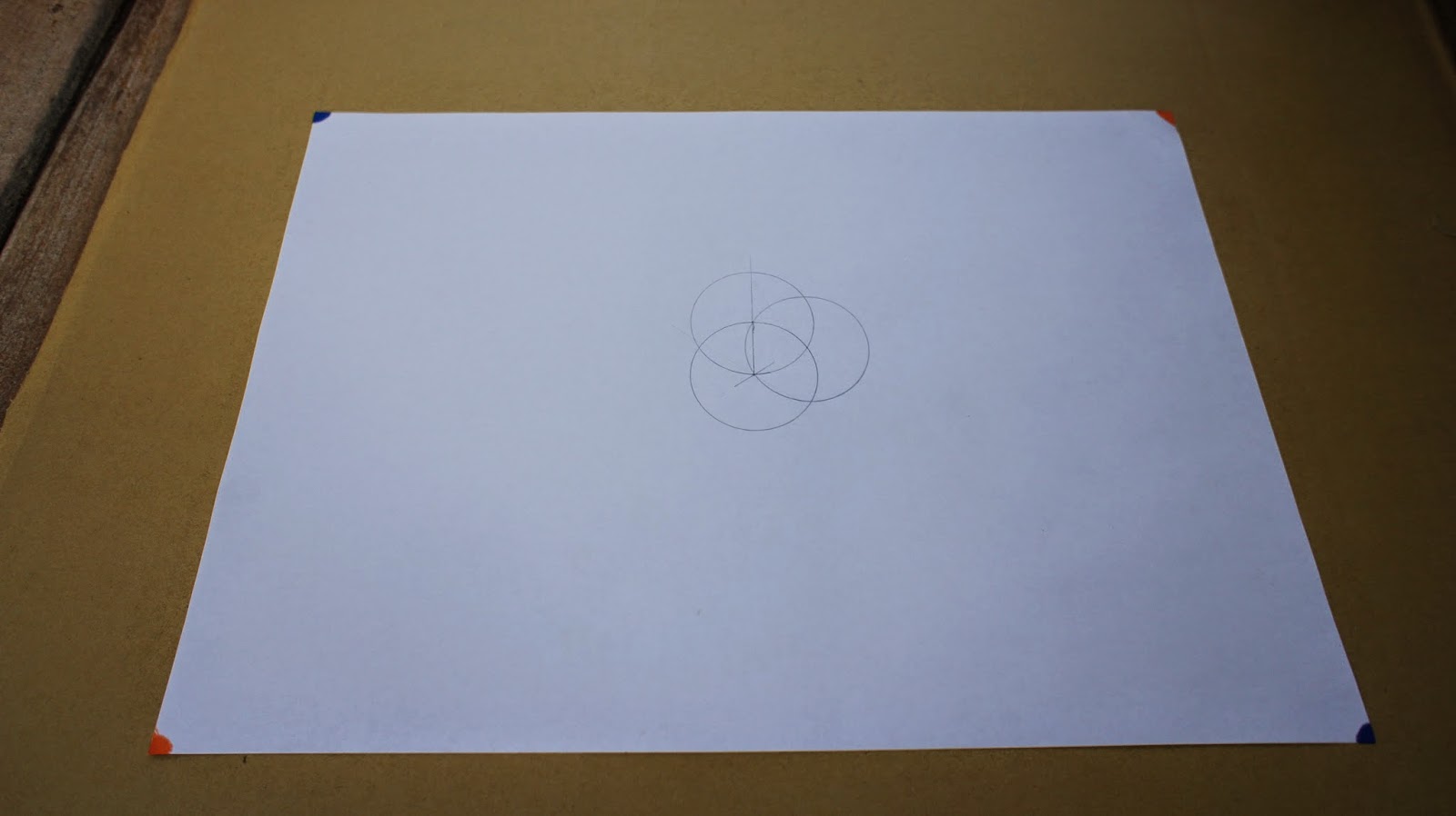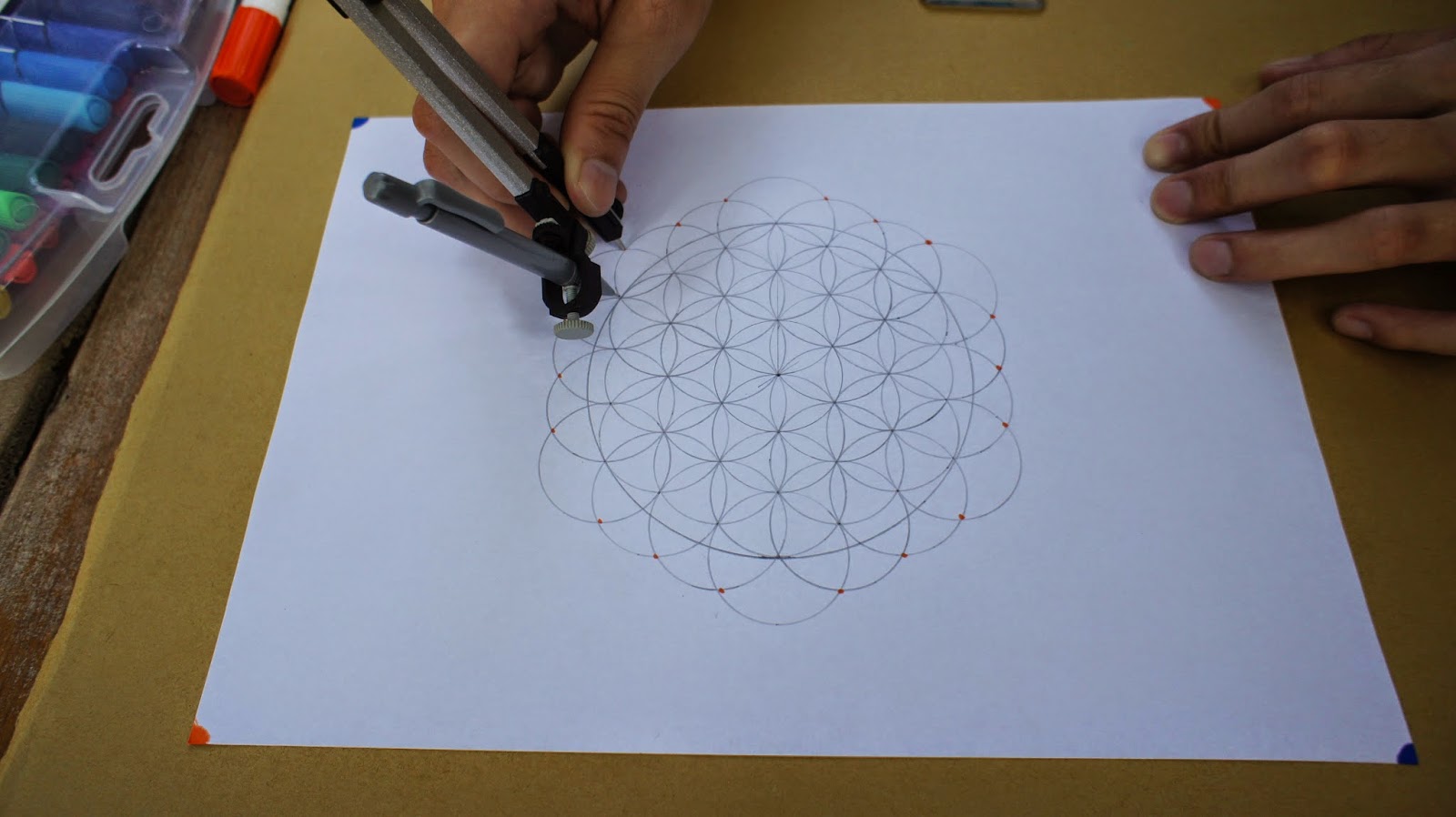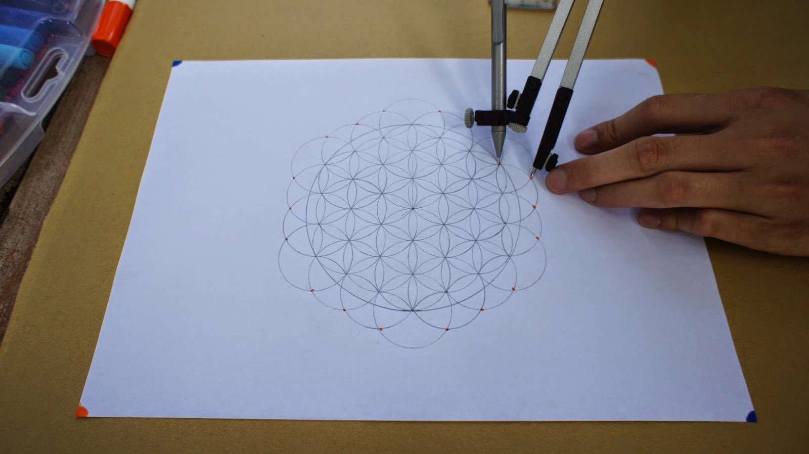 接下來是重頭戲,將圓規的定心針放置於圖紙的中心點,就可以繪畫第一個圓