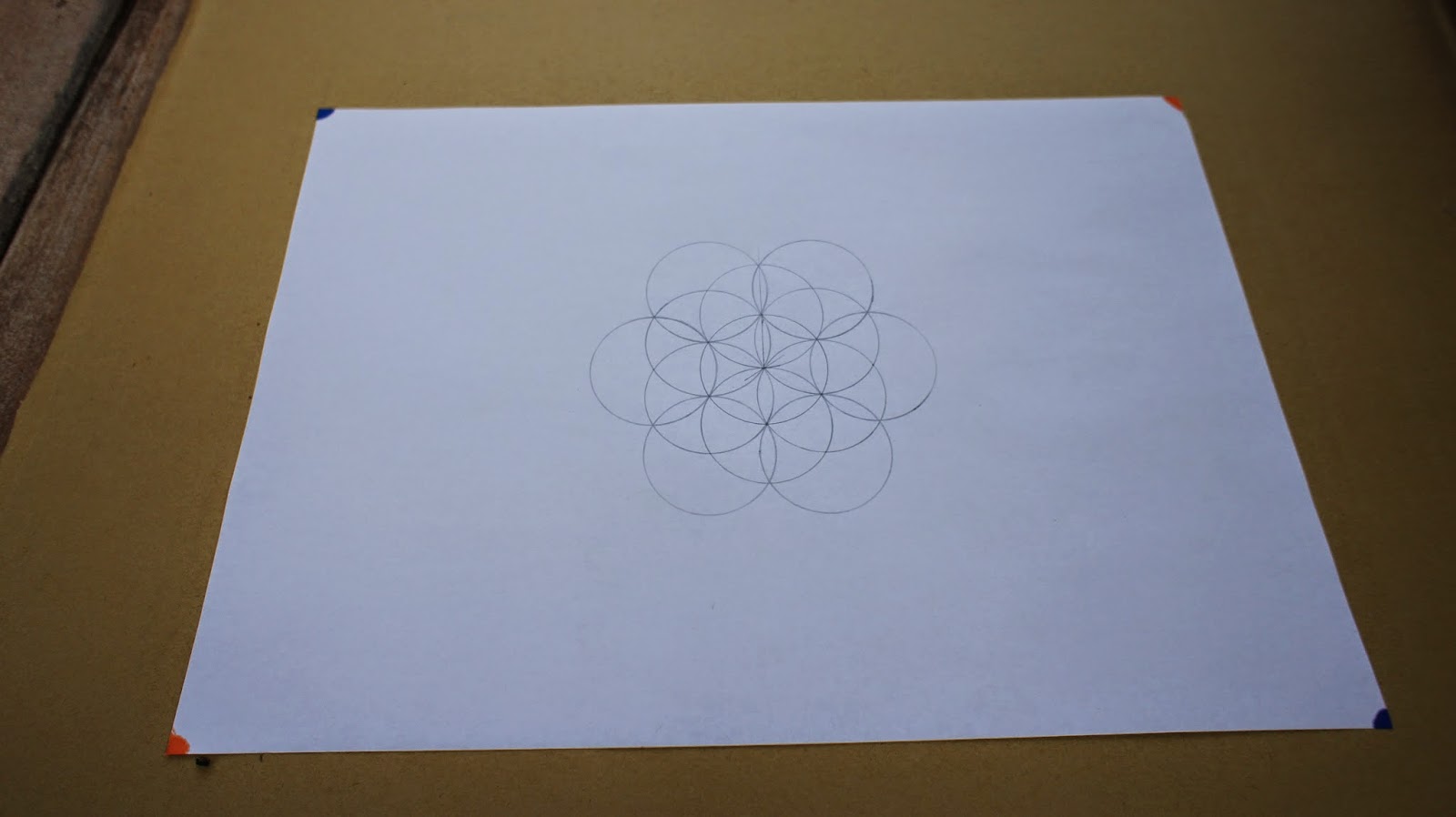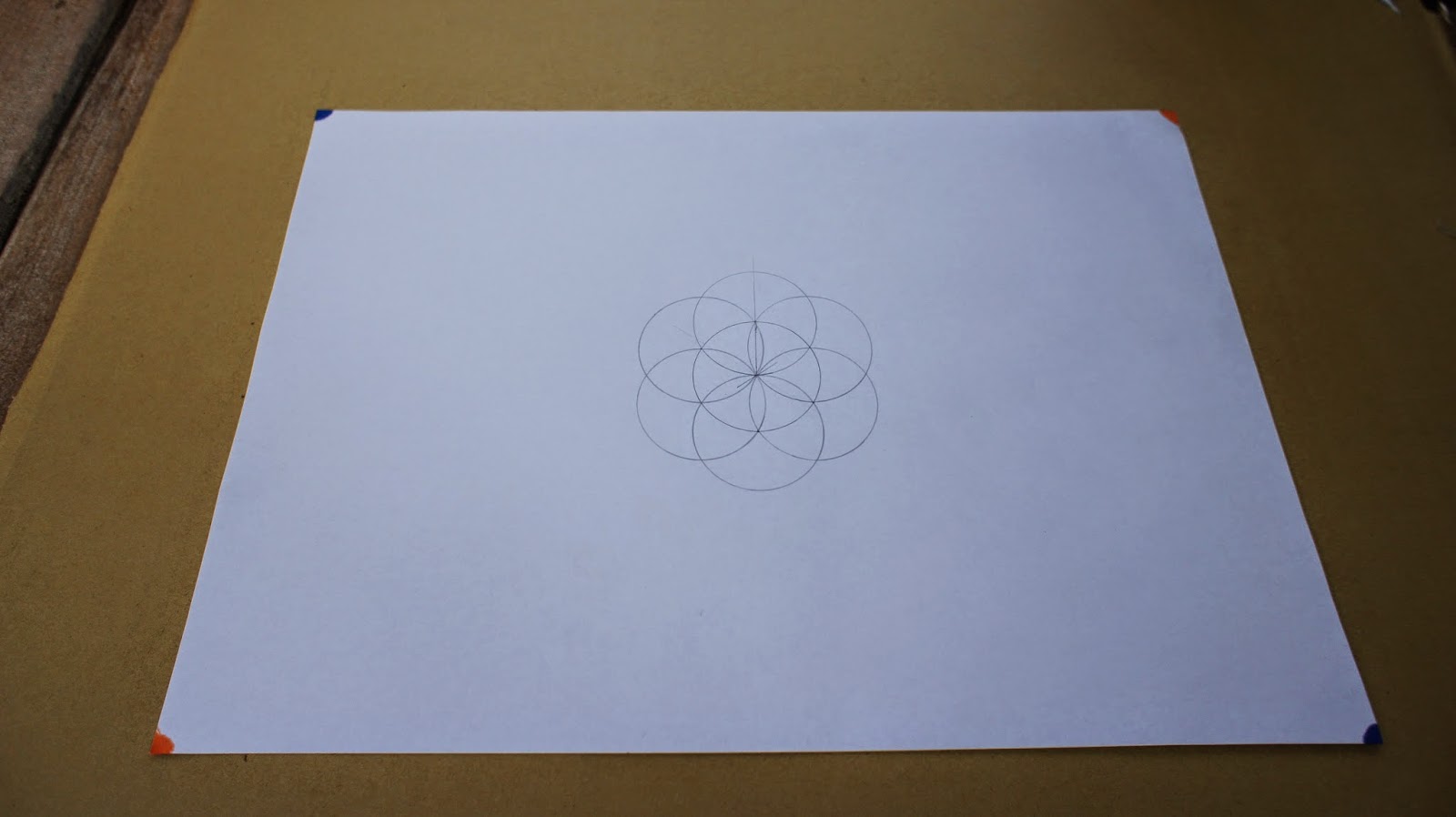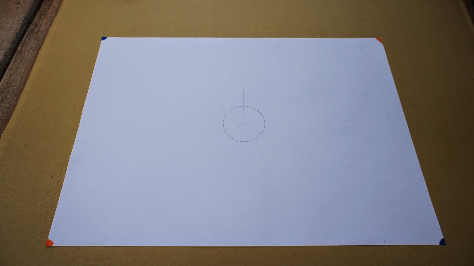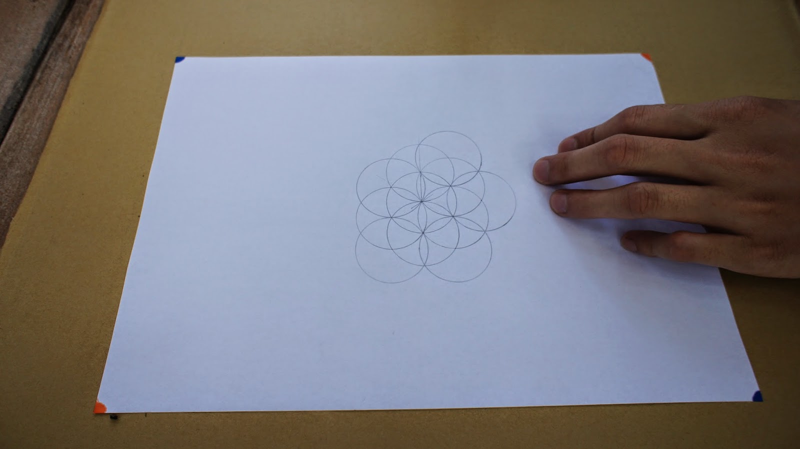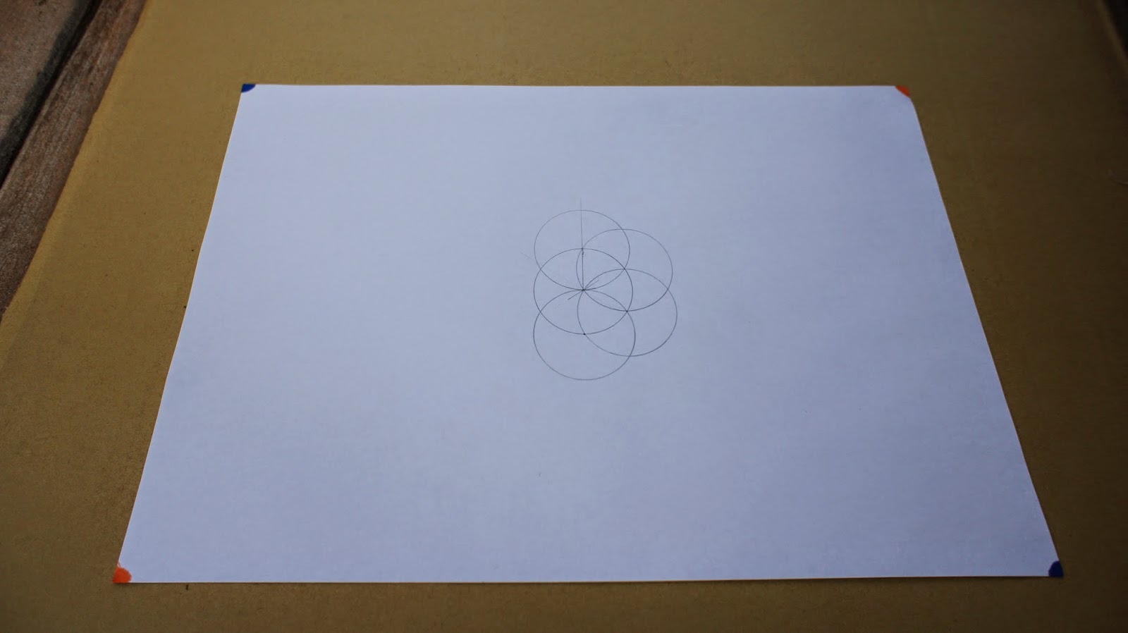 接下來是重頭戲,將圓規的定心針放置於圖紙的中心點,就可以繪畫第一個圓