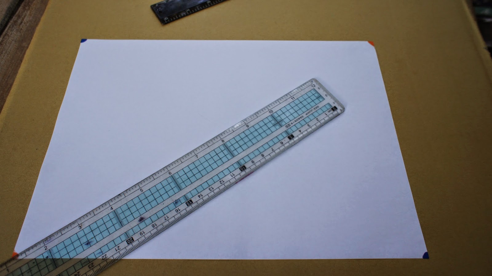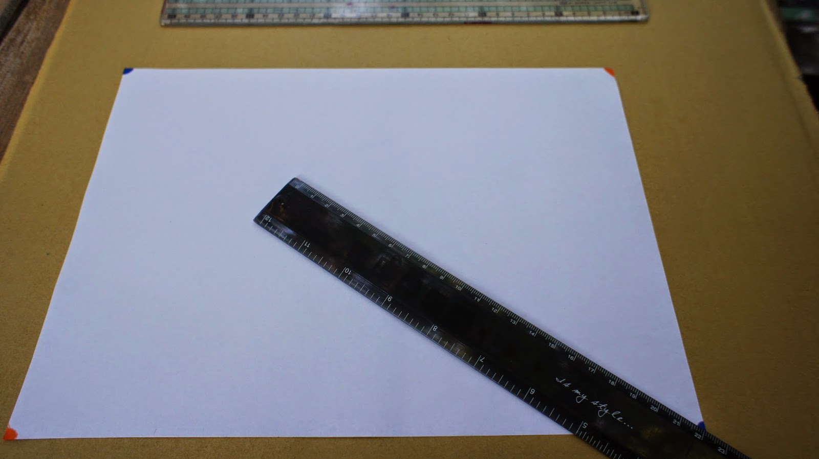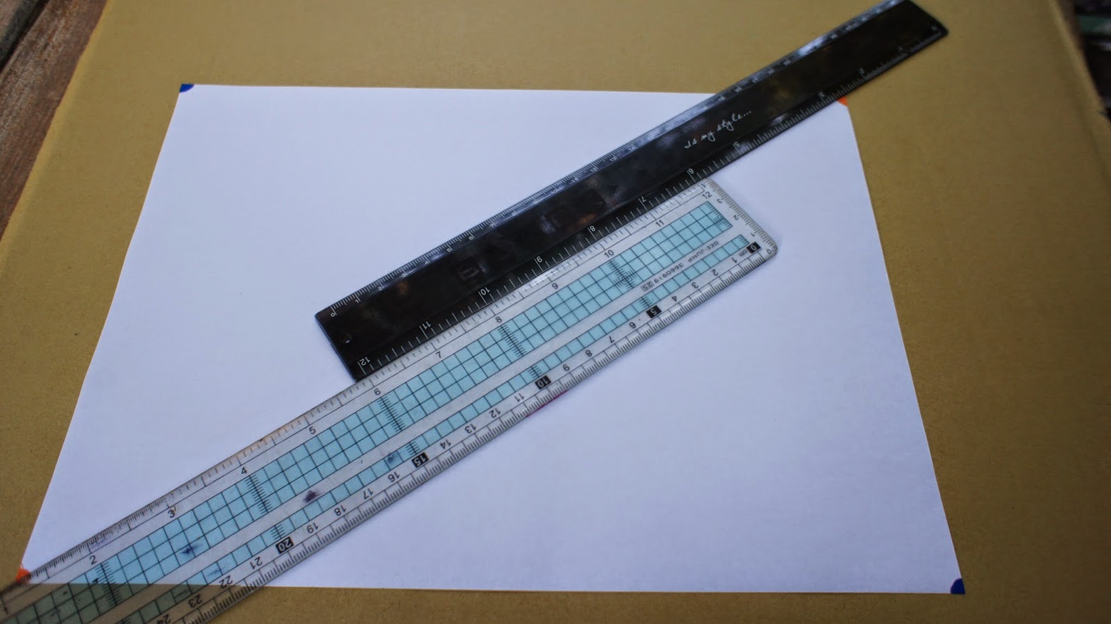 兩支直尺並攏,尺不夠長,可以1M尺,用意是找出圖紙的中心點,讓幾何圖騰在圖紙置中