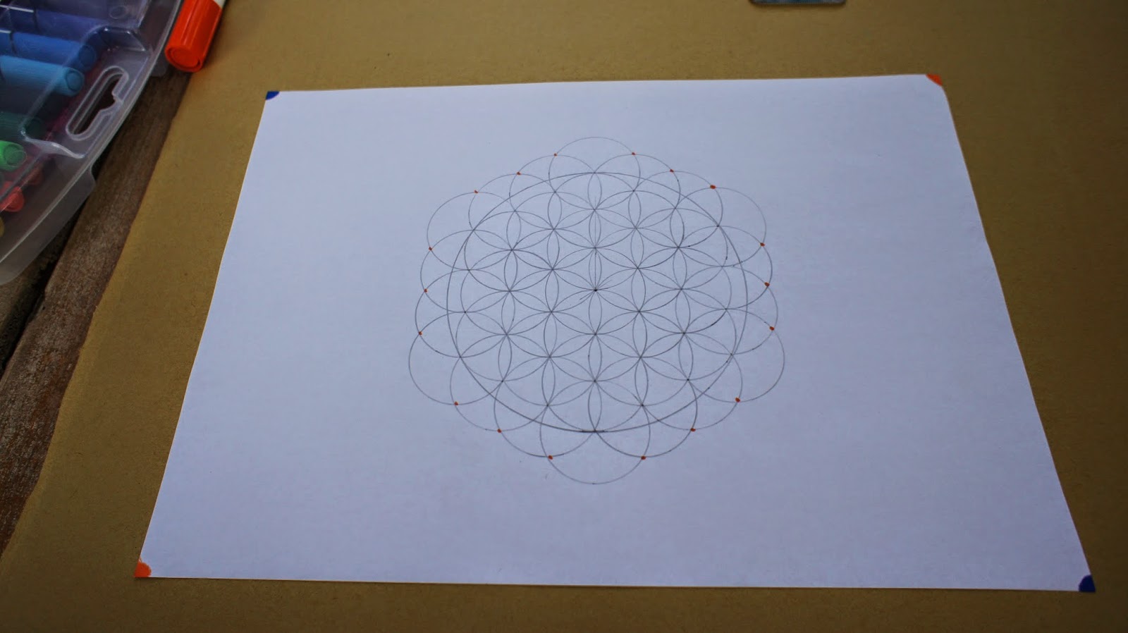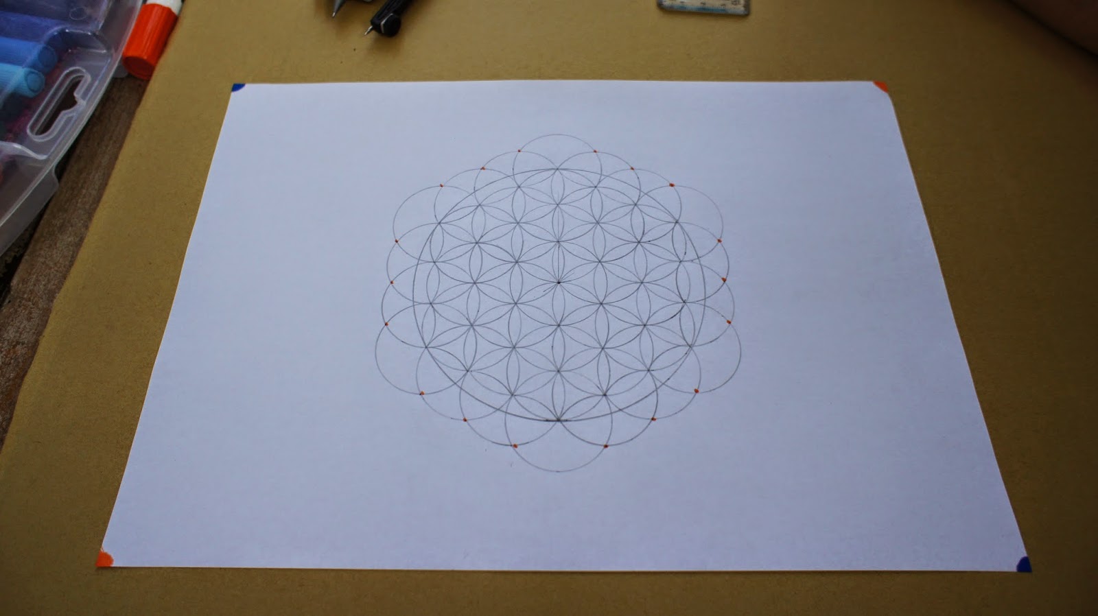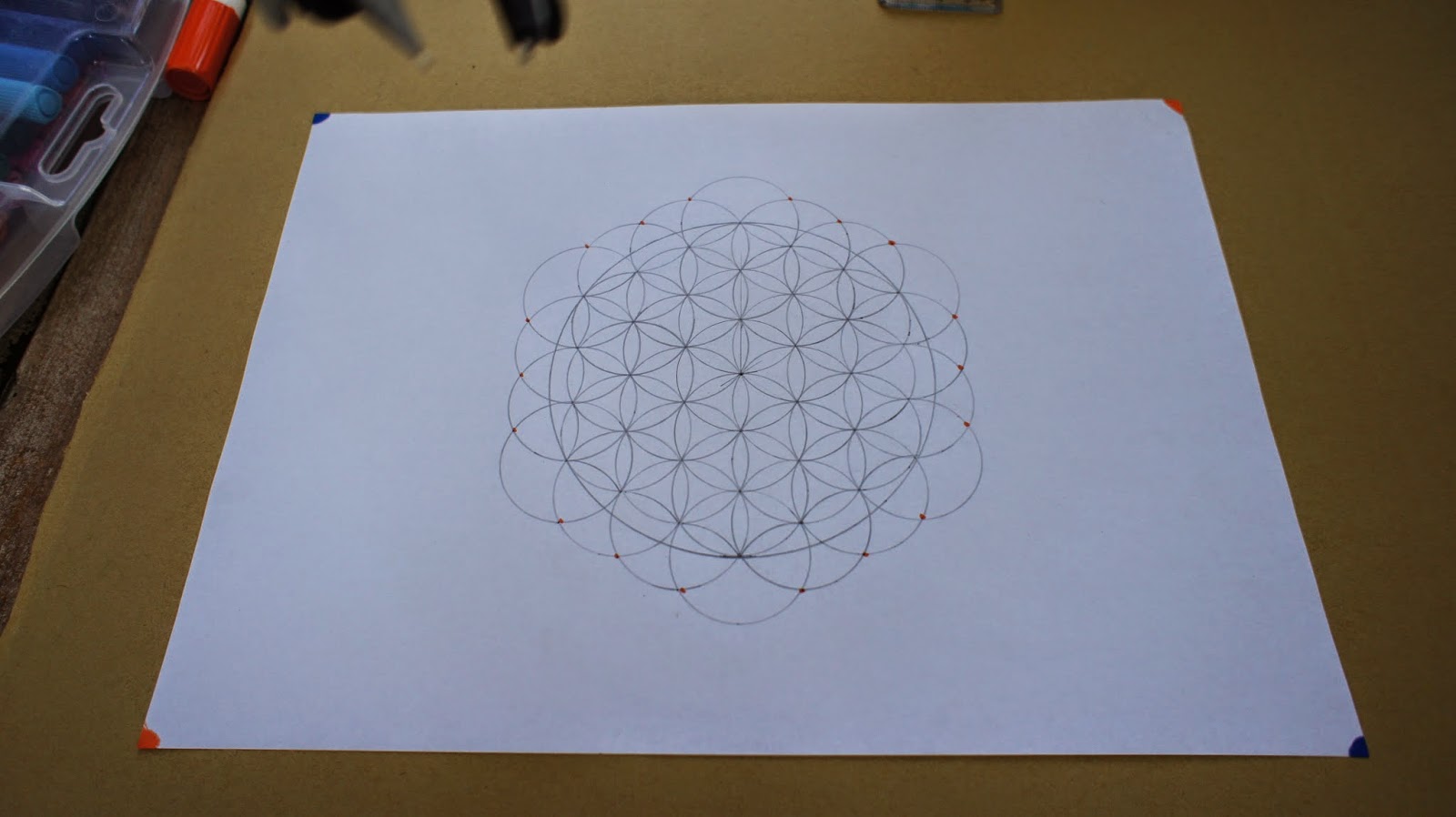 交叉線已完成,也看到交叉點,找出圖紙的中心點,要讓幾何圖騰在圖紙置中